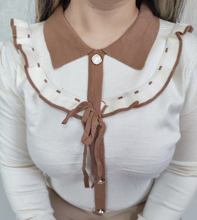 این بافت جذاب با یقه پاپیونی دولایه یه حسِ دخترونه و ملایم به استایل میده. بافتش نرم و لطیفه و قشنگ رو تن میشینه، نه گشاد، نه چسبون—کاملاً خوشفرم.